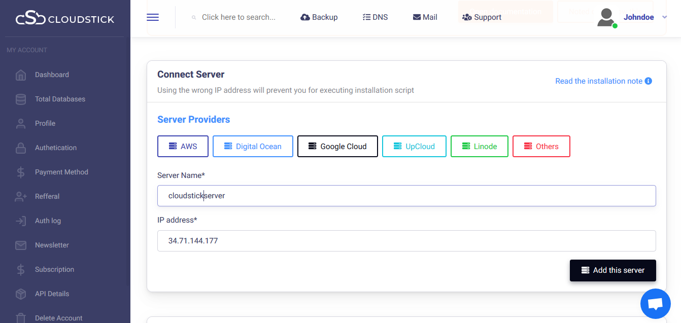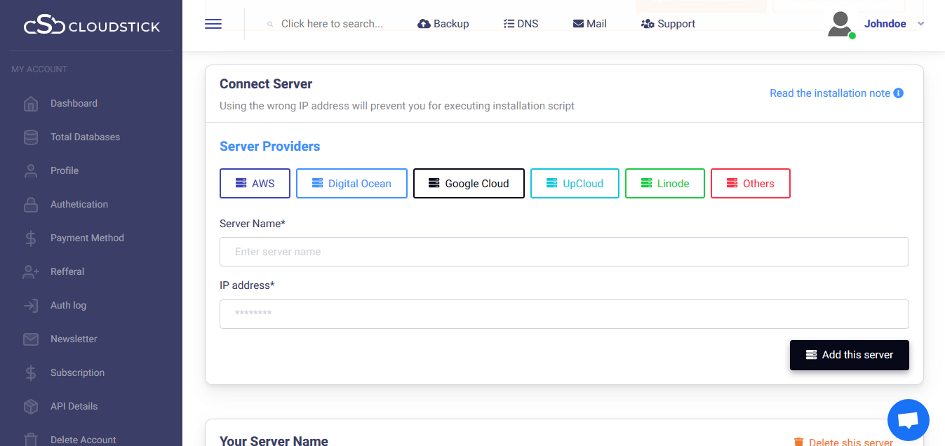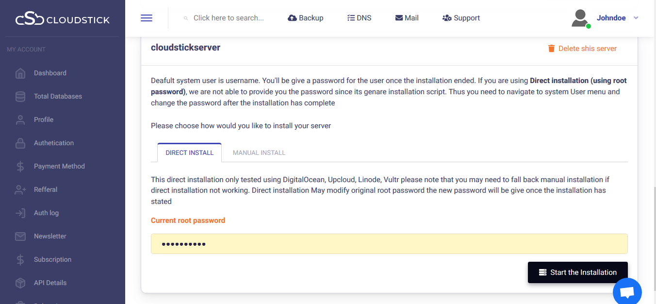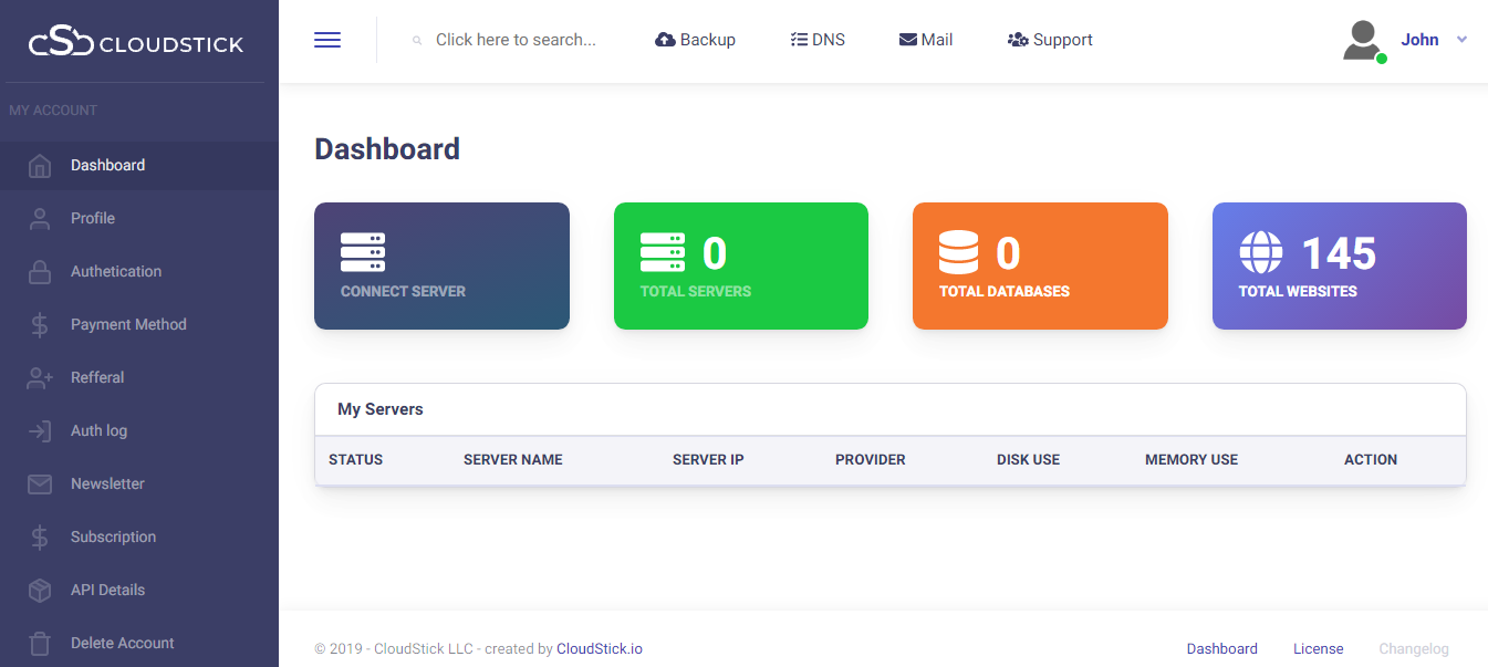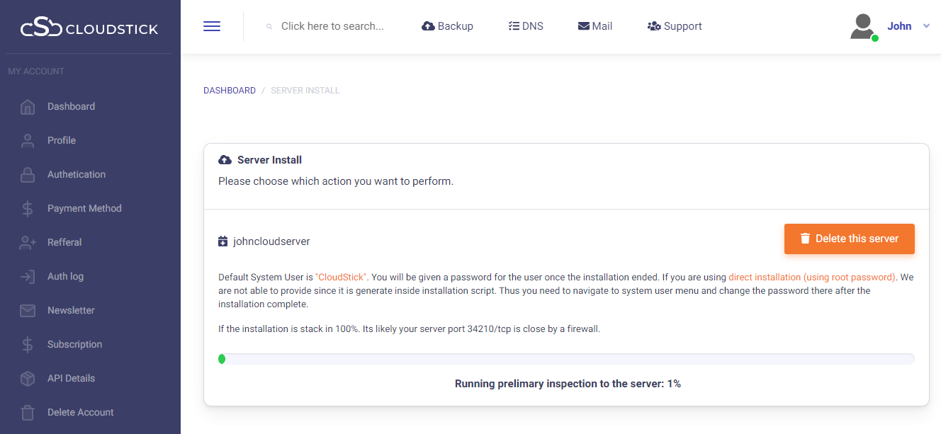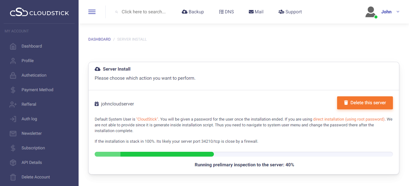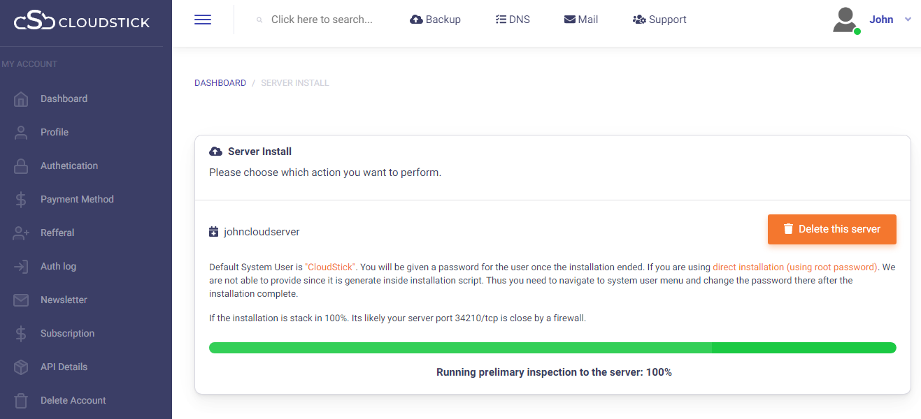 The installation progress can be viewed and within few minutes, attains completion Your server is ready to manage from the CloudStick dashboard.