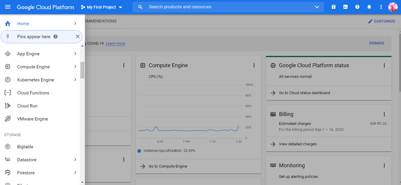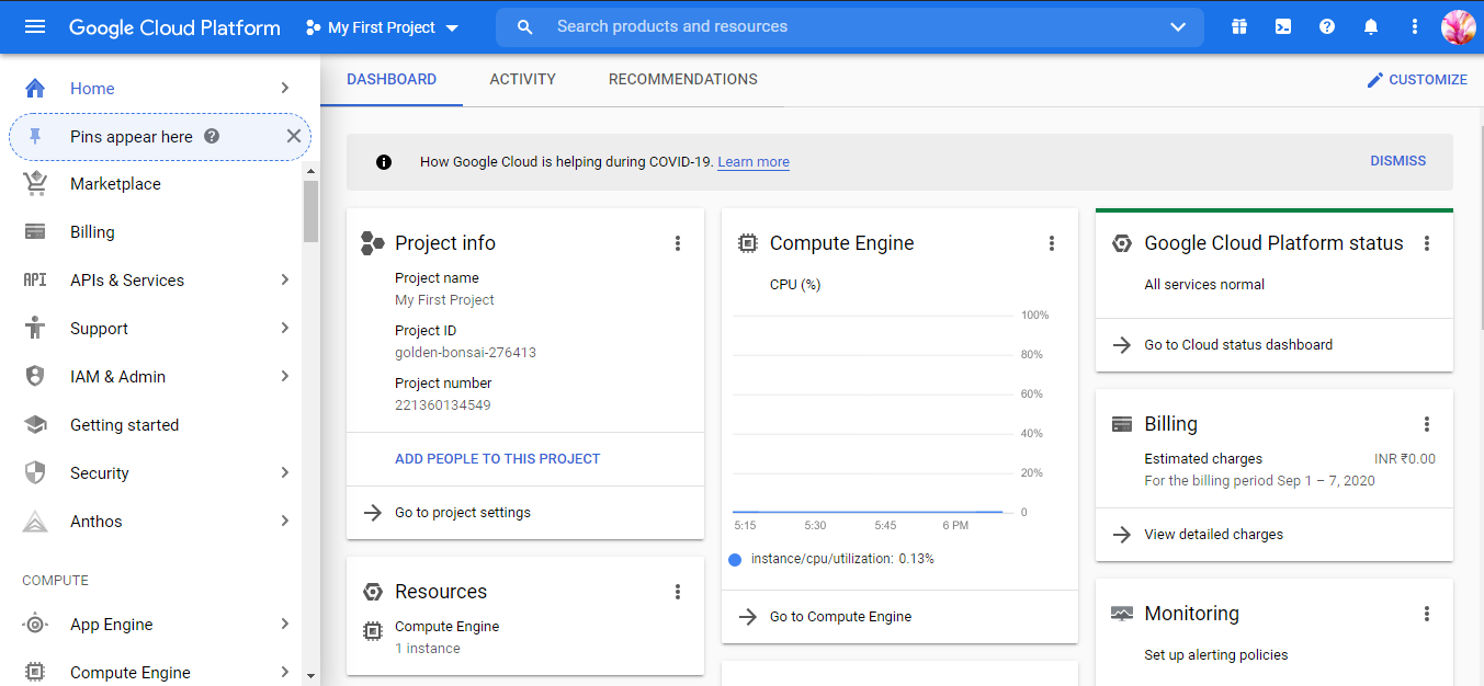 Step 2: Once signed up and logged in you can see the Google Cloud dashboard.