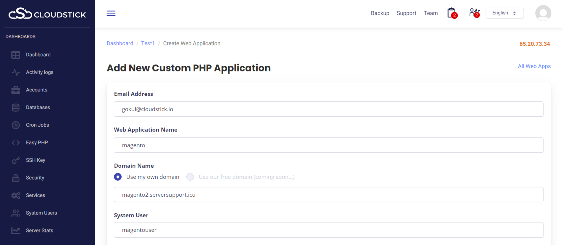 For ‘Domain name’, you can use either your own domain or a CloudStick free domain. If you are using your own domain, make sure you configure the DNS record for the same.
