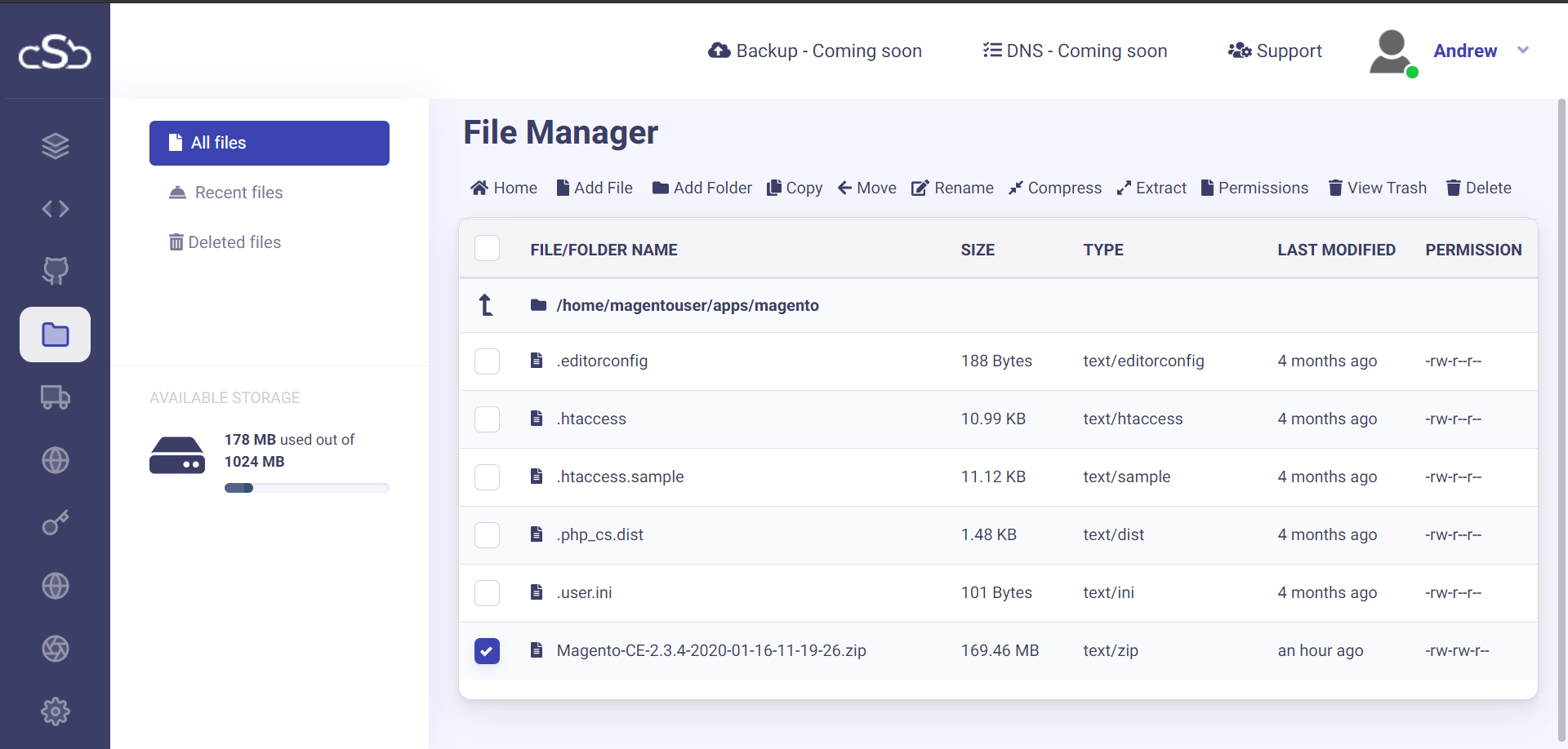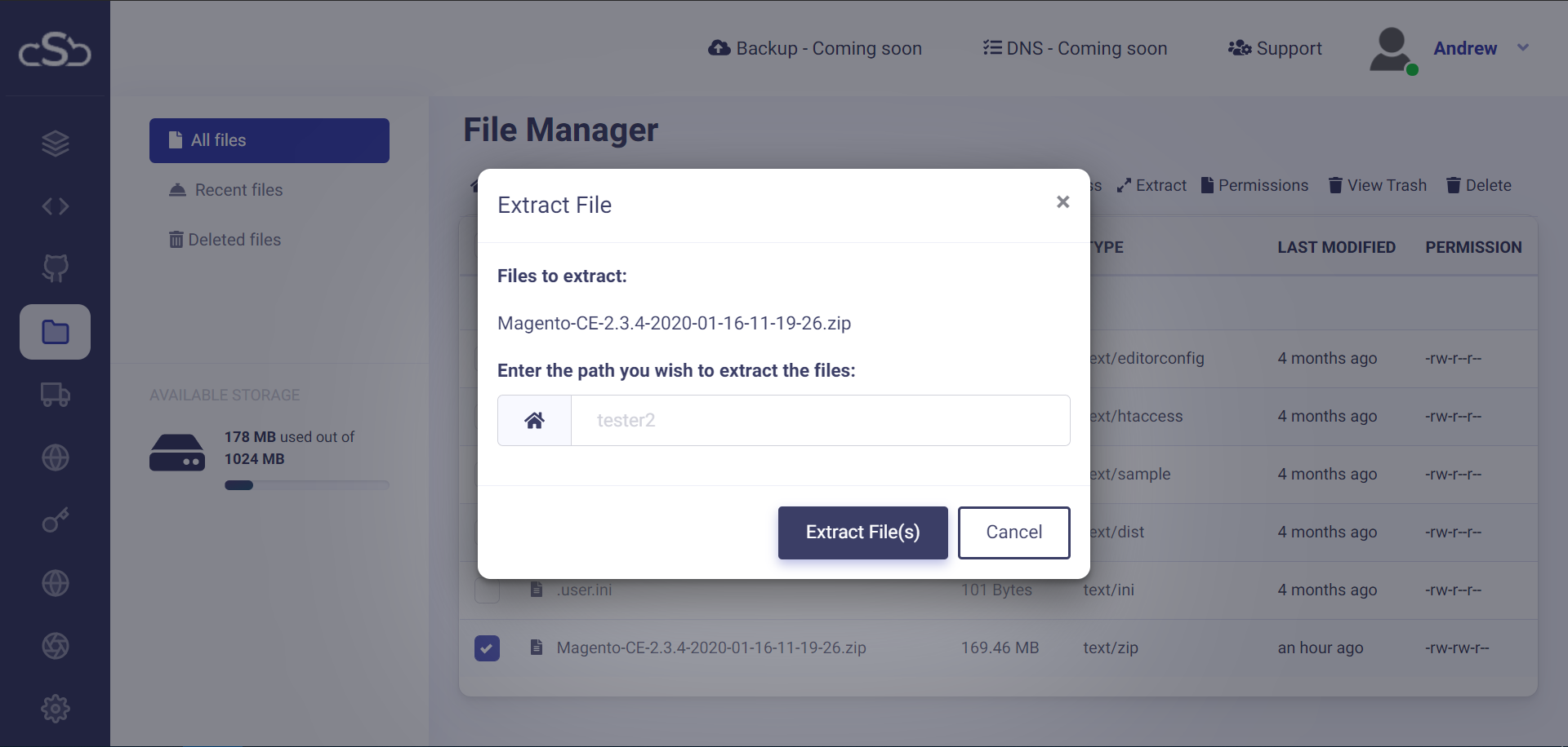 After transferring the file via Filezilla, unzip the file from the CloudStick dashboard.