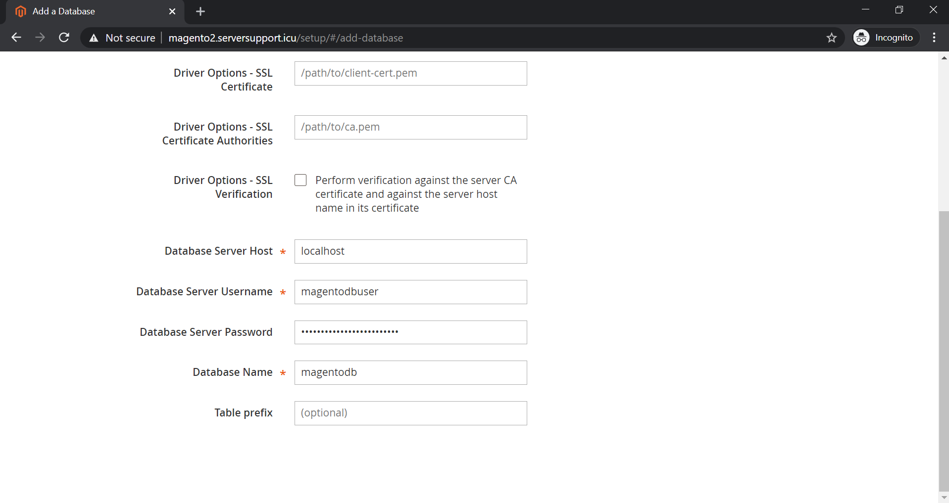 In the database section inside Magento 2 installation, use localhost as the database host. Then provide the database details which we created earlier.