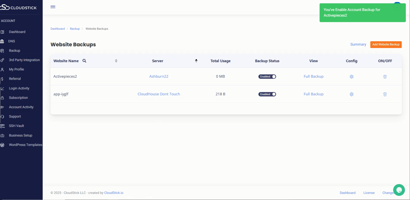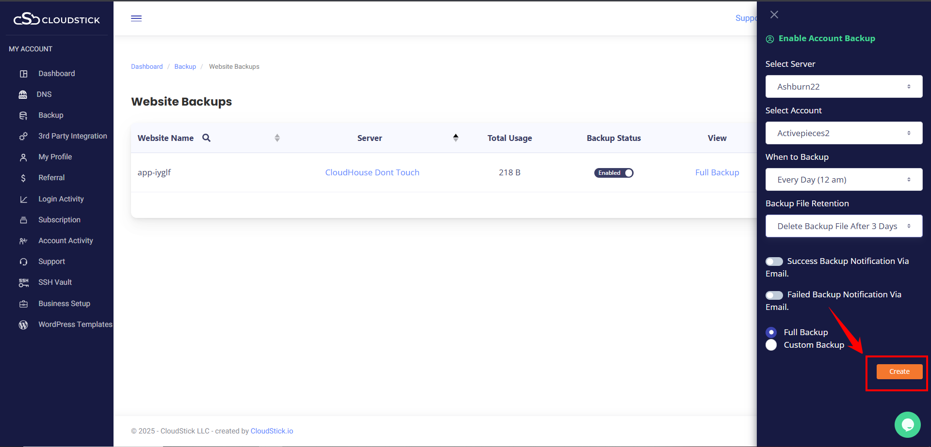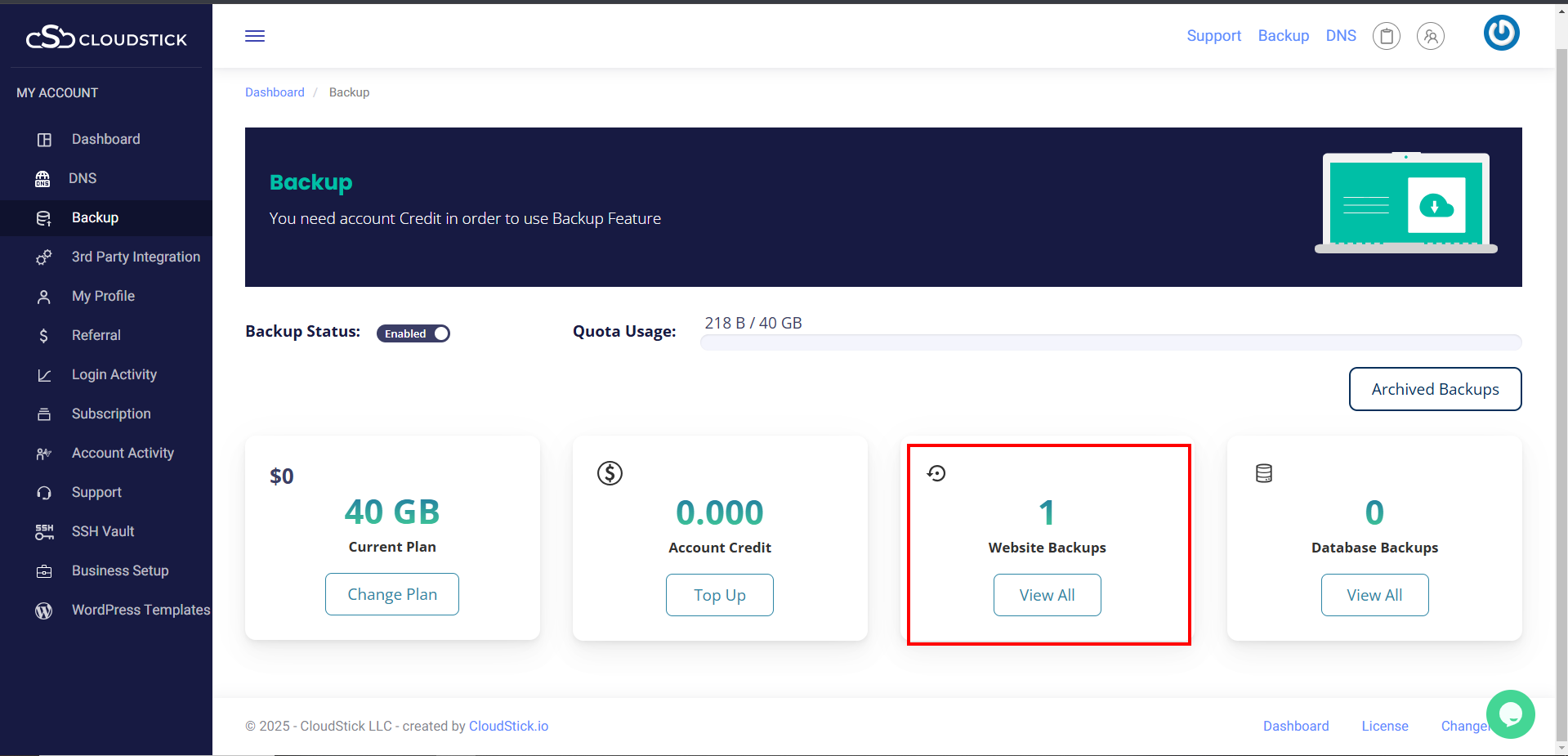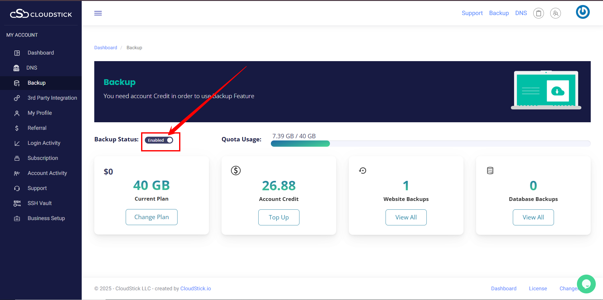 The backup status will be disabled by default and you need to enable this to activate and avail the free backup storage quota. All plans other than ‘Trial ‘ and ‘Free’ have free Quota accordingly. If you need more backup space, you can purchase using your credit and you can see the options in the 3rd screenshot.