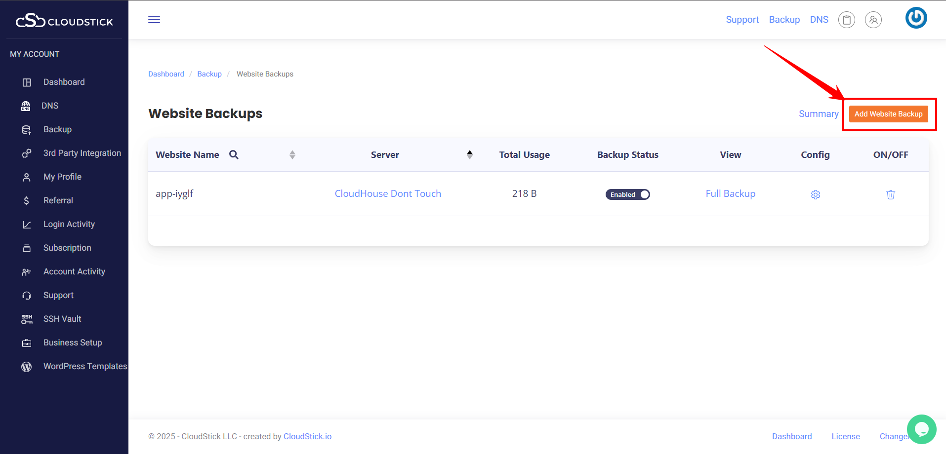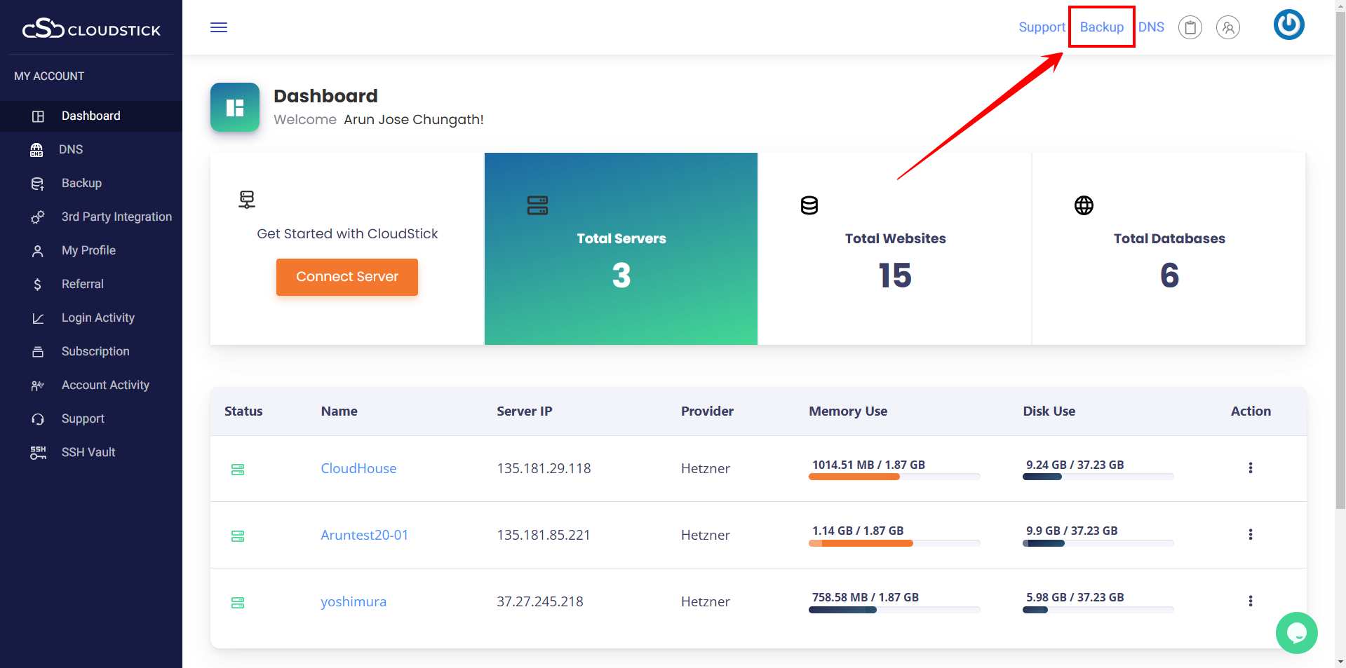2. Navigate to backup from the header, on the top right corner and click on it.