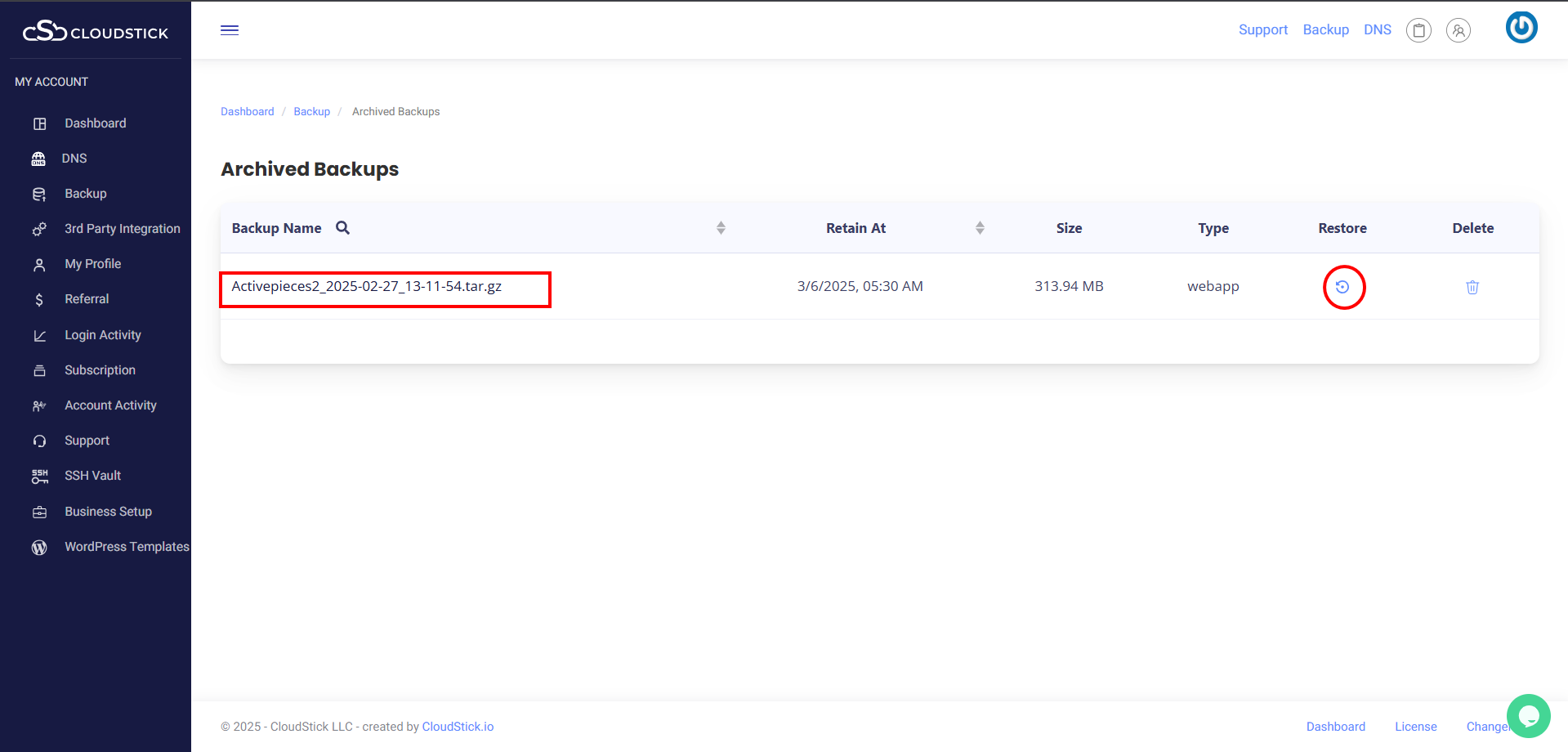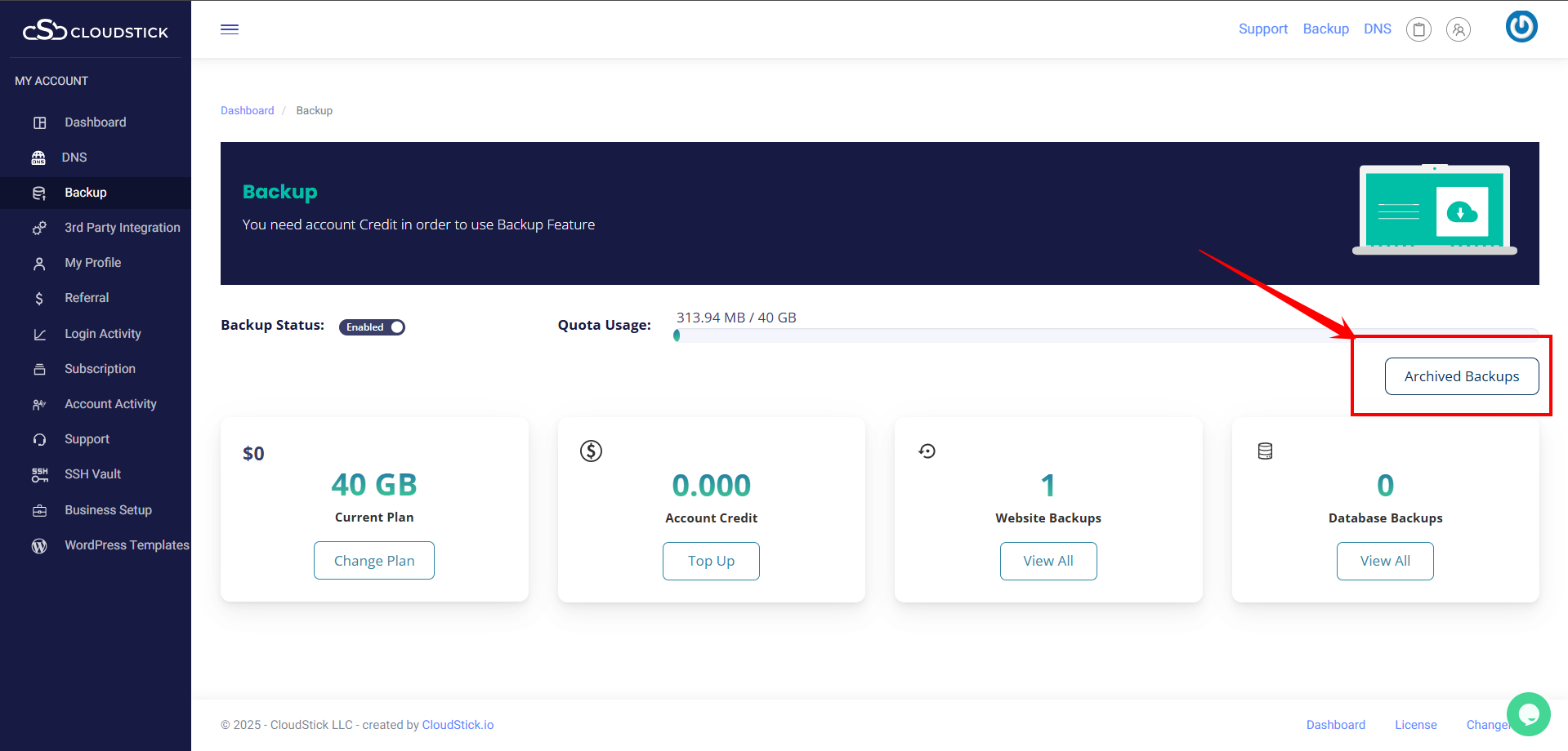 Now , go to Backup page from Dashboard and click on Archived backup.