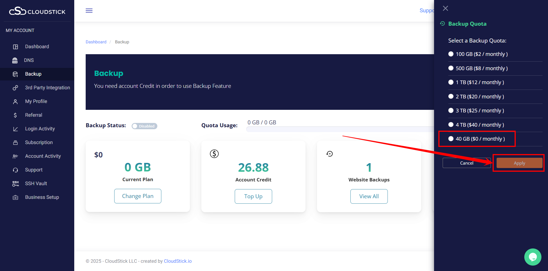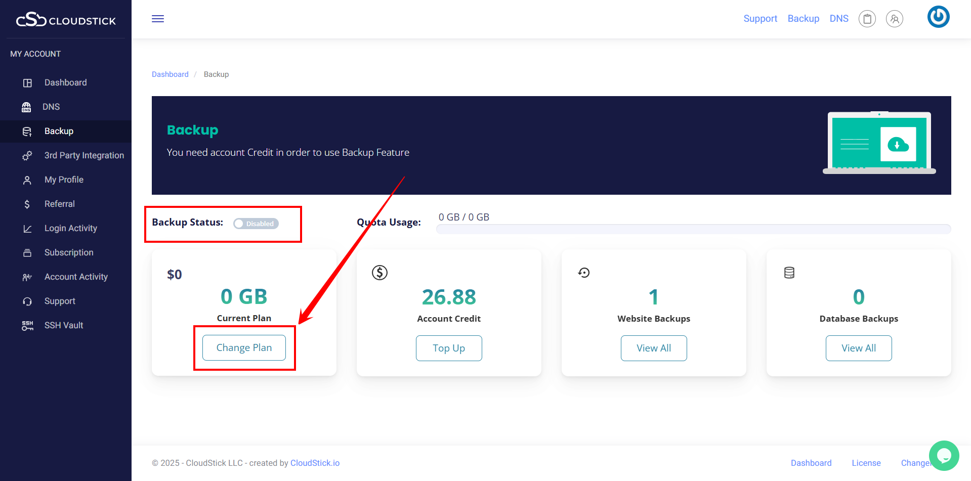 4. Click on Change plan then select backup Quota as per your plan and then click on Apply.