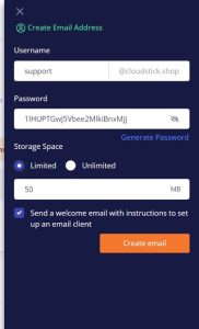 Create a New Email Address: Look for the ‘Create Email Address’ option. Here, you will only need to enter the desired email name (like “info” or “contact” or any other name of your choice ) as the domain (e.g., @CloudStick.shop) is already pre-selected.