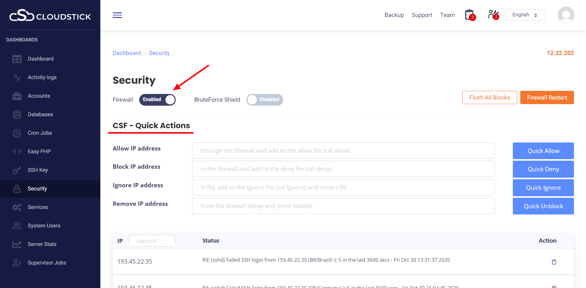 In CloudStick we use CSF as the firewall. By default it is disabled. You can enable it from here: