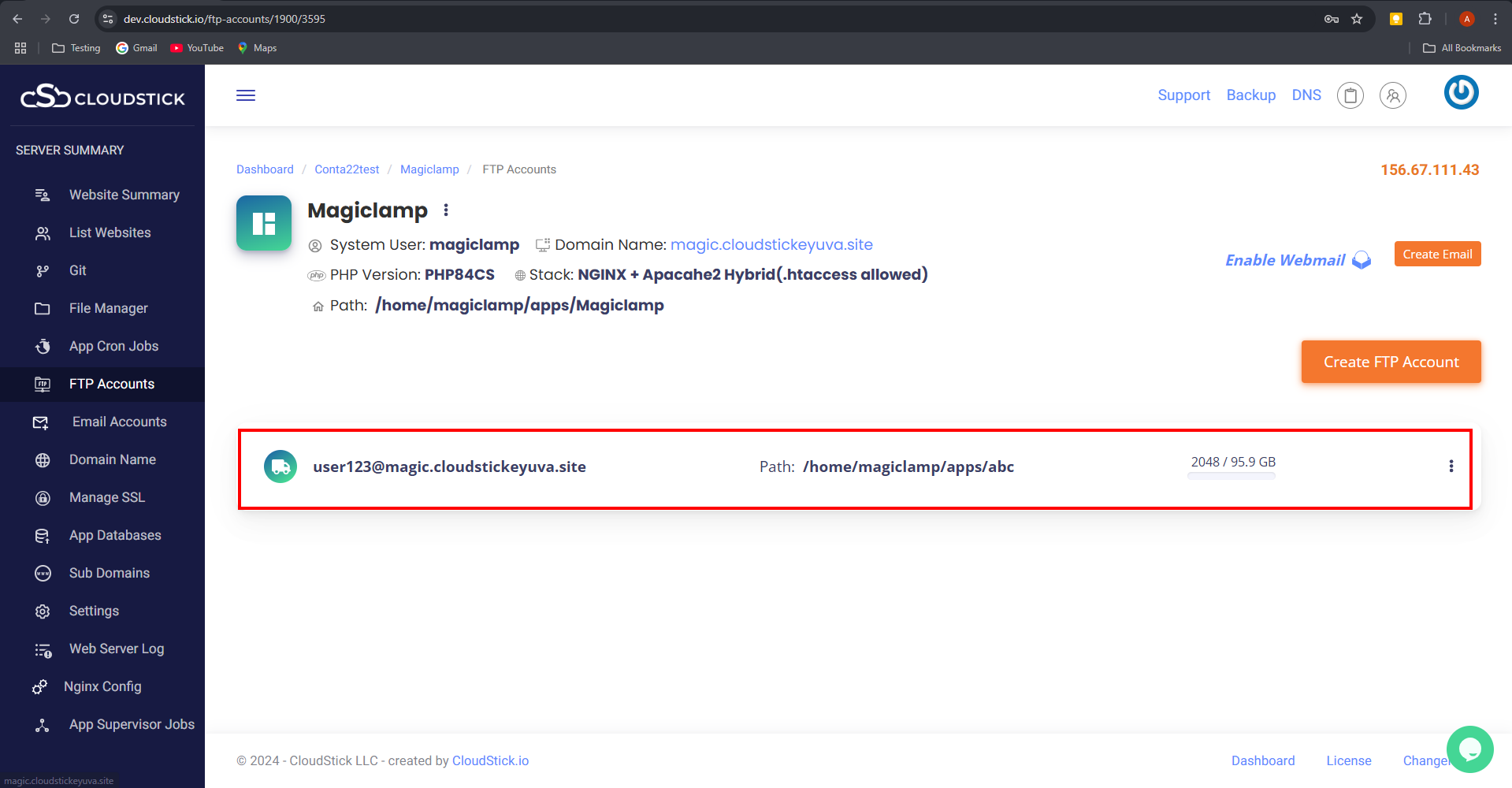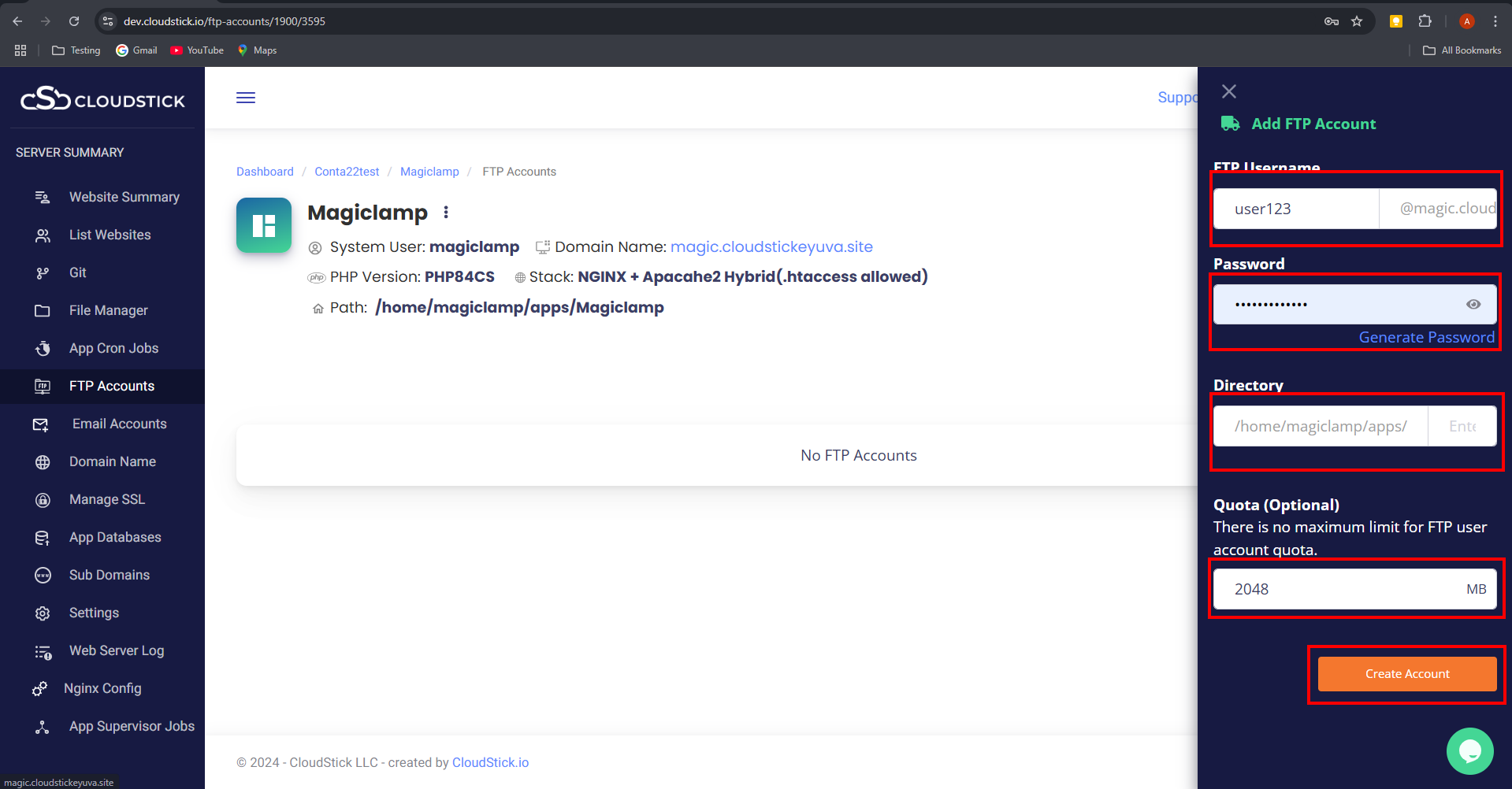 • Click Create FTP Account. The new account will appear in the FTP Accounts table.