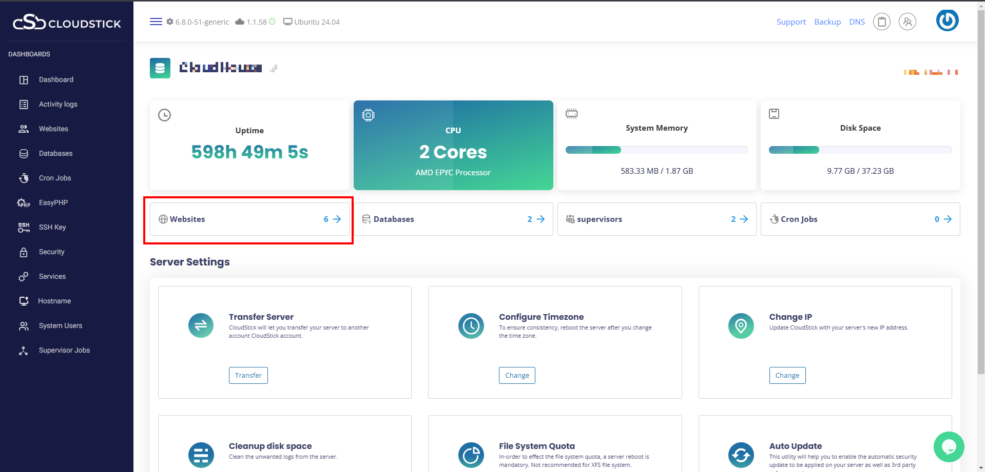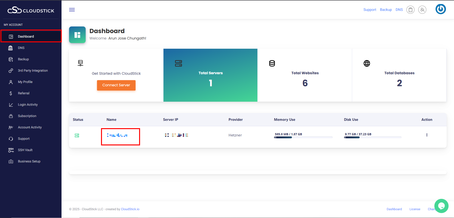 Navigate to the Cloudstick Dashboard and click on ‘Server Name’ .