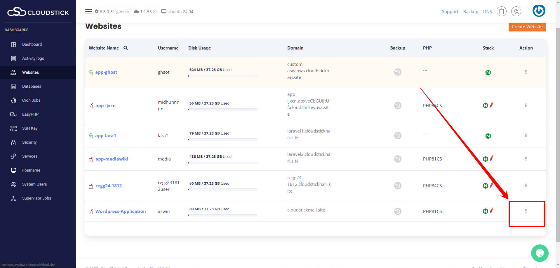 Navigate to the menu button of the particular Website which has to be suspended and click it.