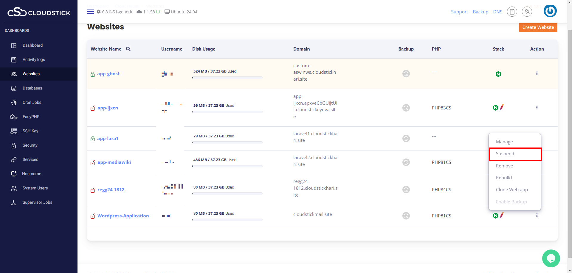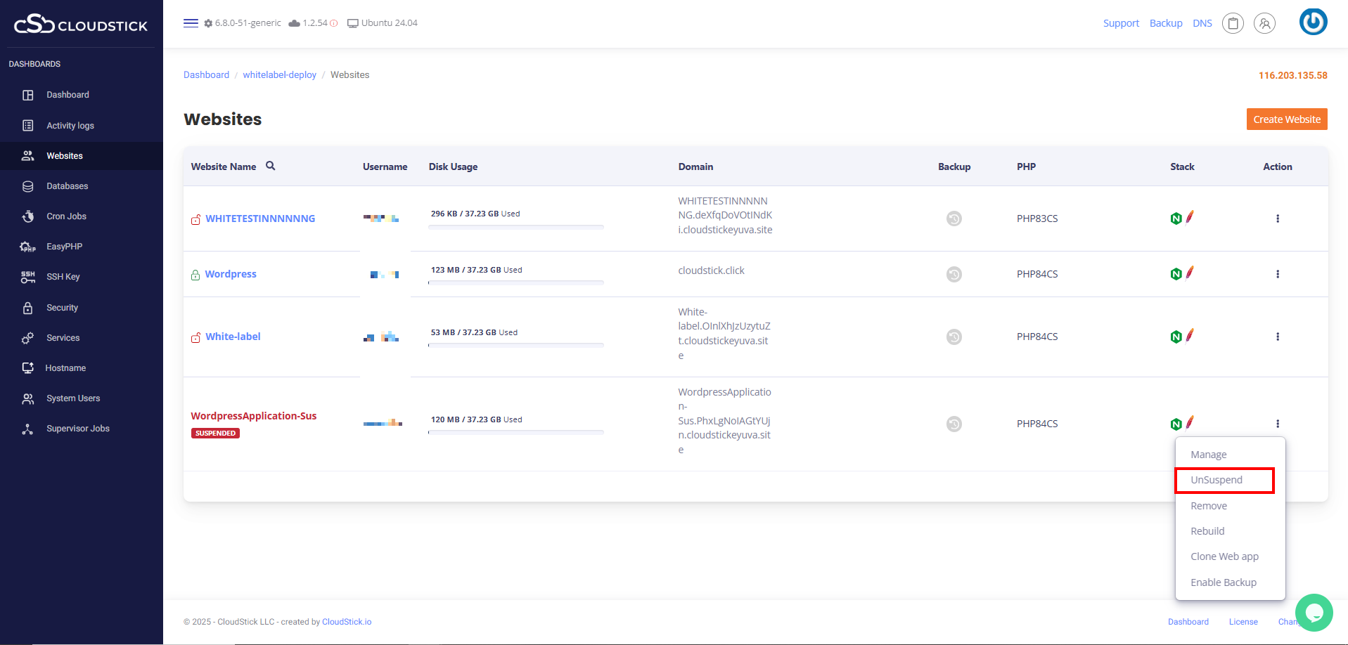 To lift the suspension, simply navigate to the website menu again and select the “Unsuspend” option.