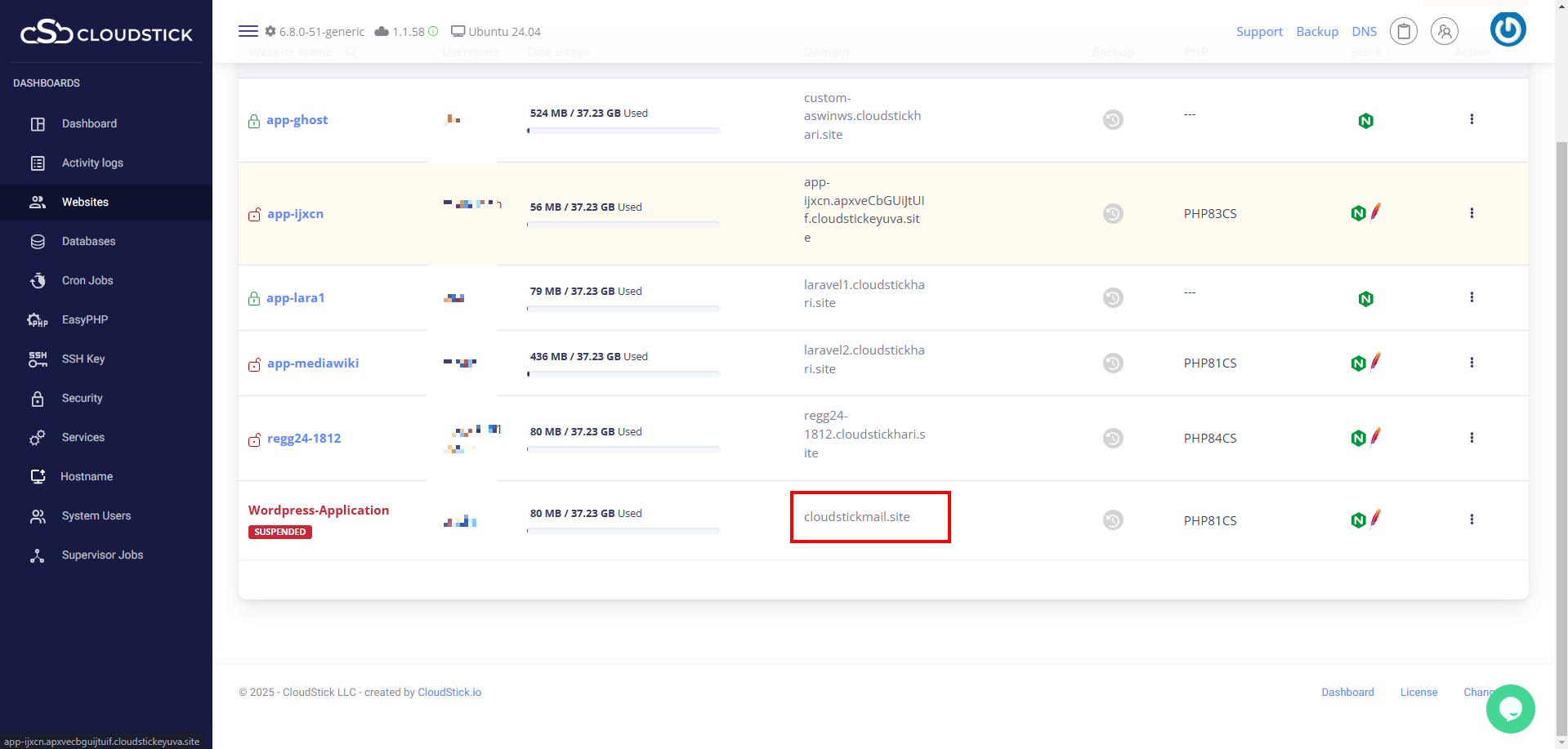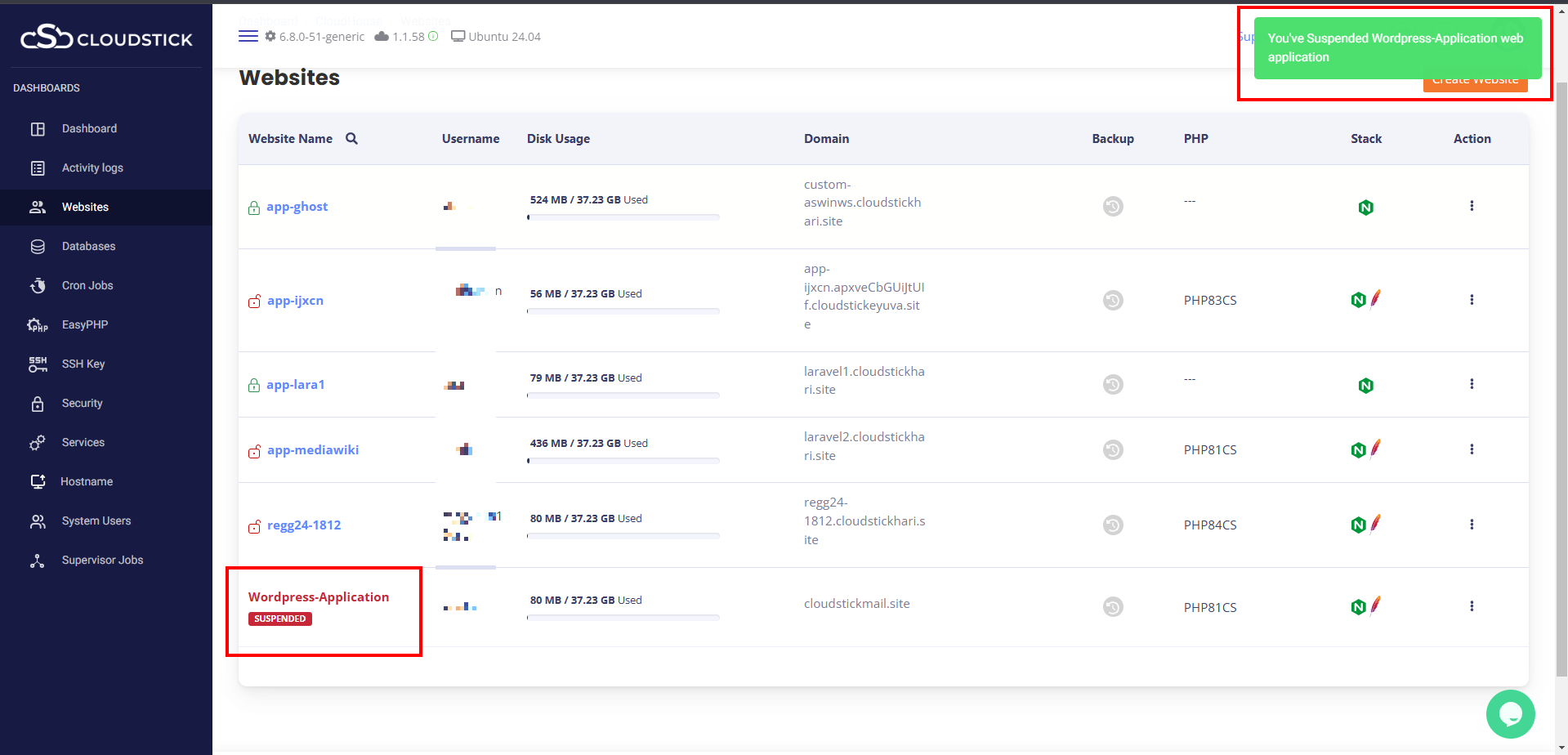 You will receive a success notification, and the website will be marked as ‘Suspended.’.