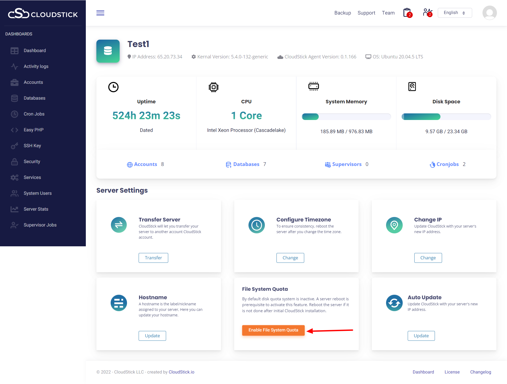 Filesystem quotas allow server owners to limit the amount of disk space that an account uses. On the menu scroll down to file system quota to enable it in your server. You need to do a reboot to enable the quota successfully.