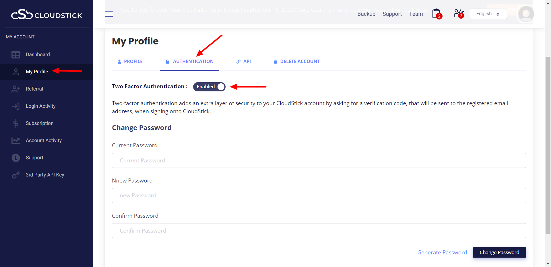 Navigate to the DASHBOARD >> MY PROFILE>>AUTHENTICATION. Here you can enable 2-factor authentication to your CloudStick account. It will add an extra layer of security by asking for a code when signing in to CloudStick.