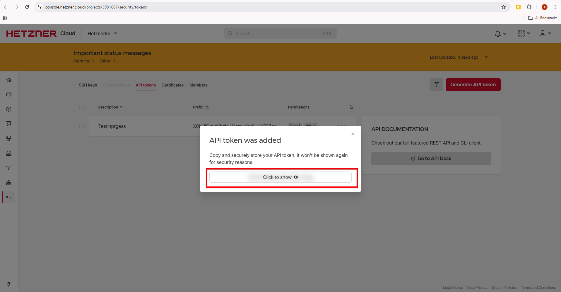 API token will be created and you should click ‘Click to show’ and copy the API key.