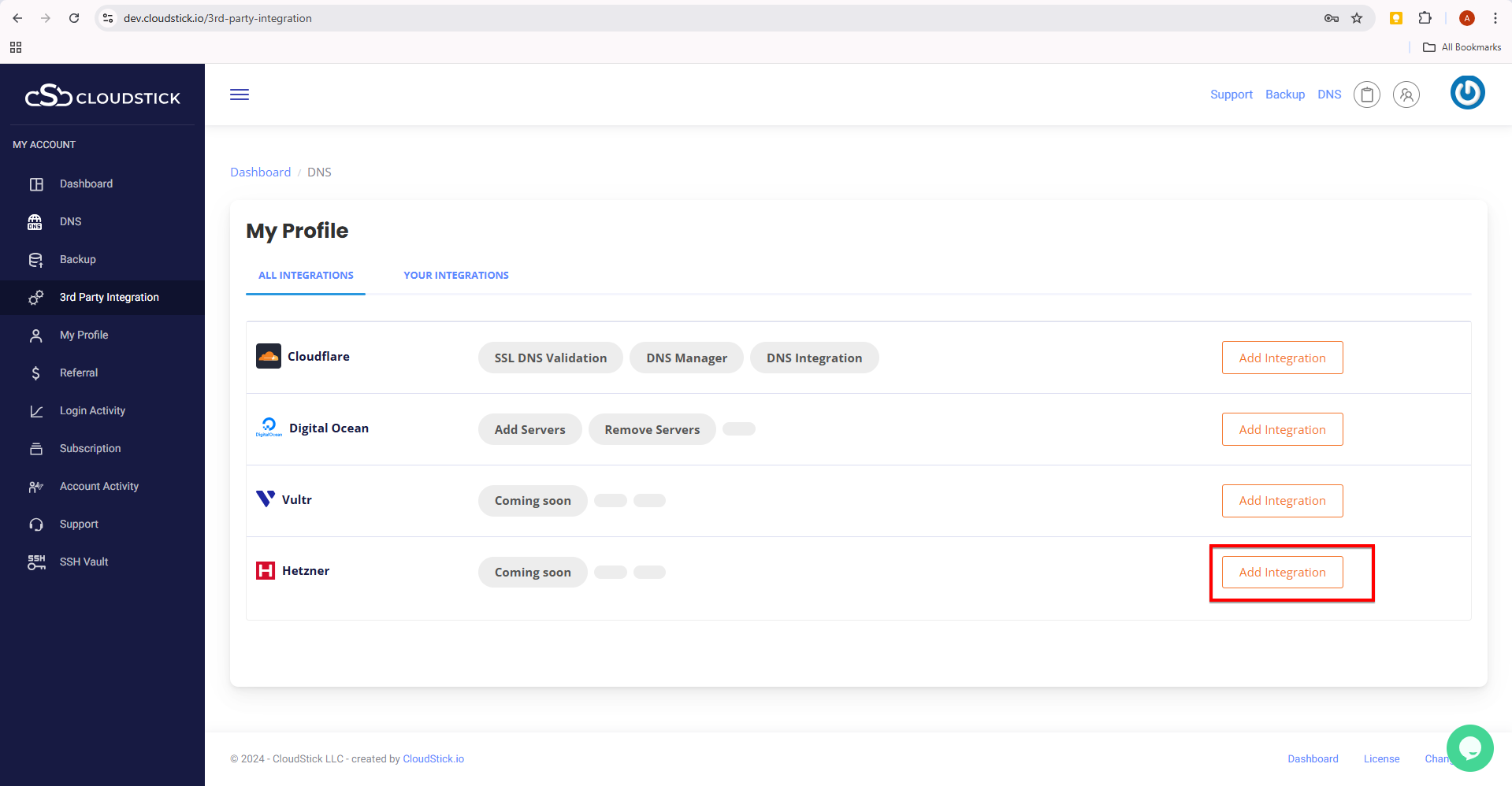 Under the ‘All integration’ click on ‘Add Integrations ‘against Hetzner.