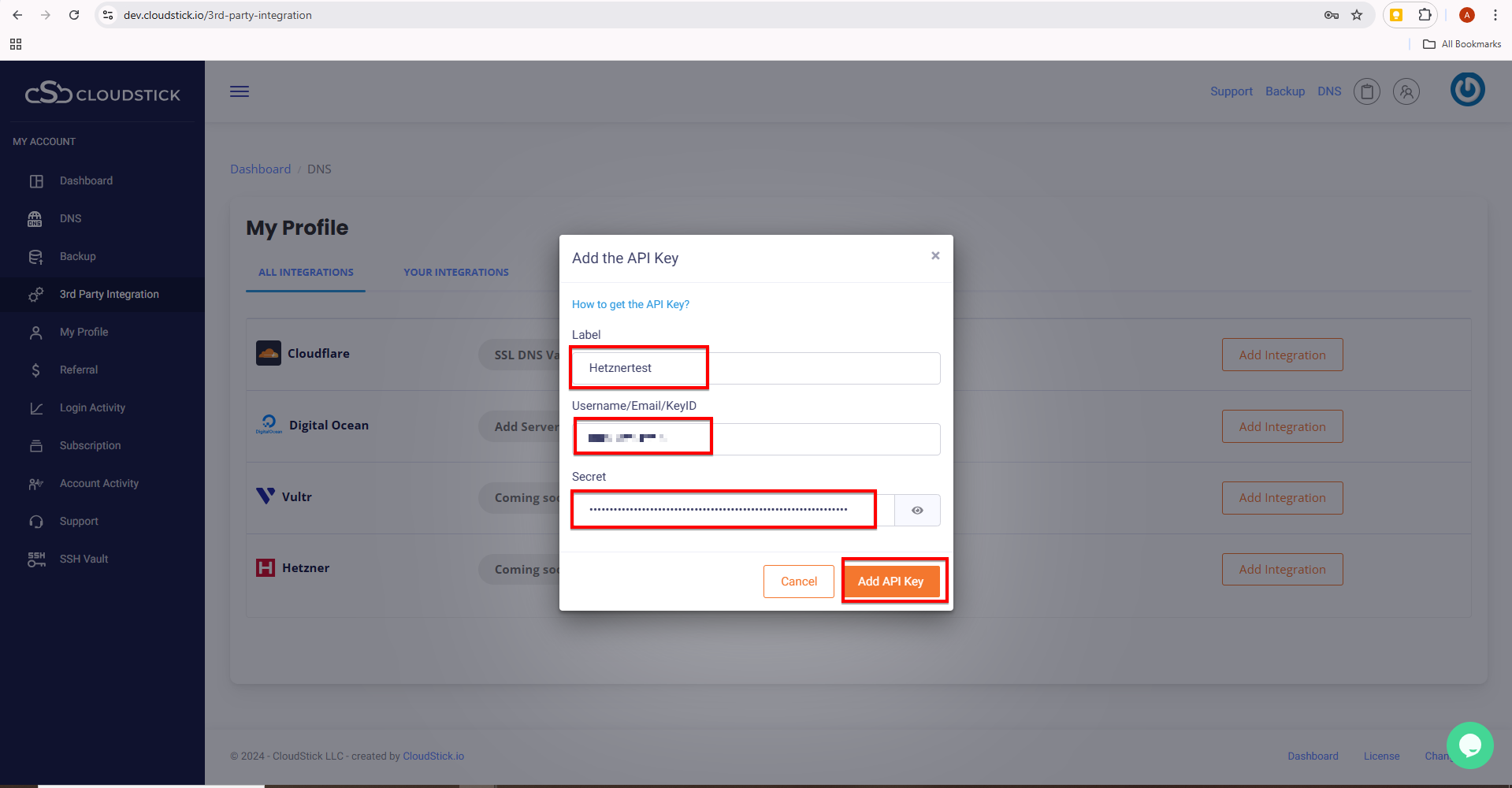 Now give the appropriate label , Hetzner account username and API key and click on ‘Add API key’.