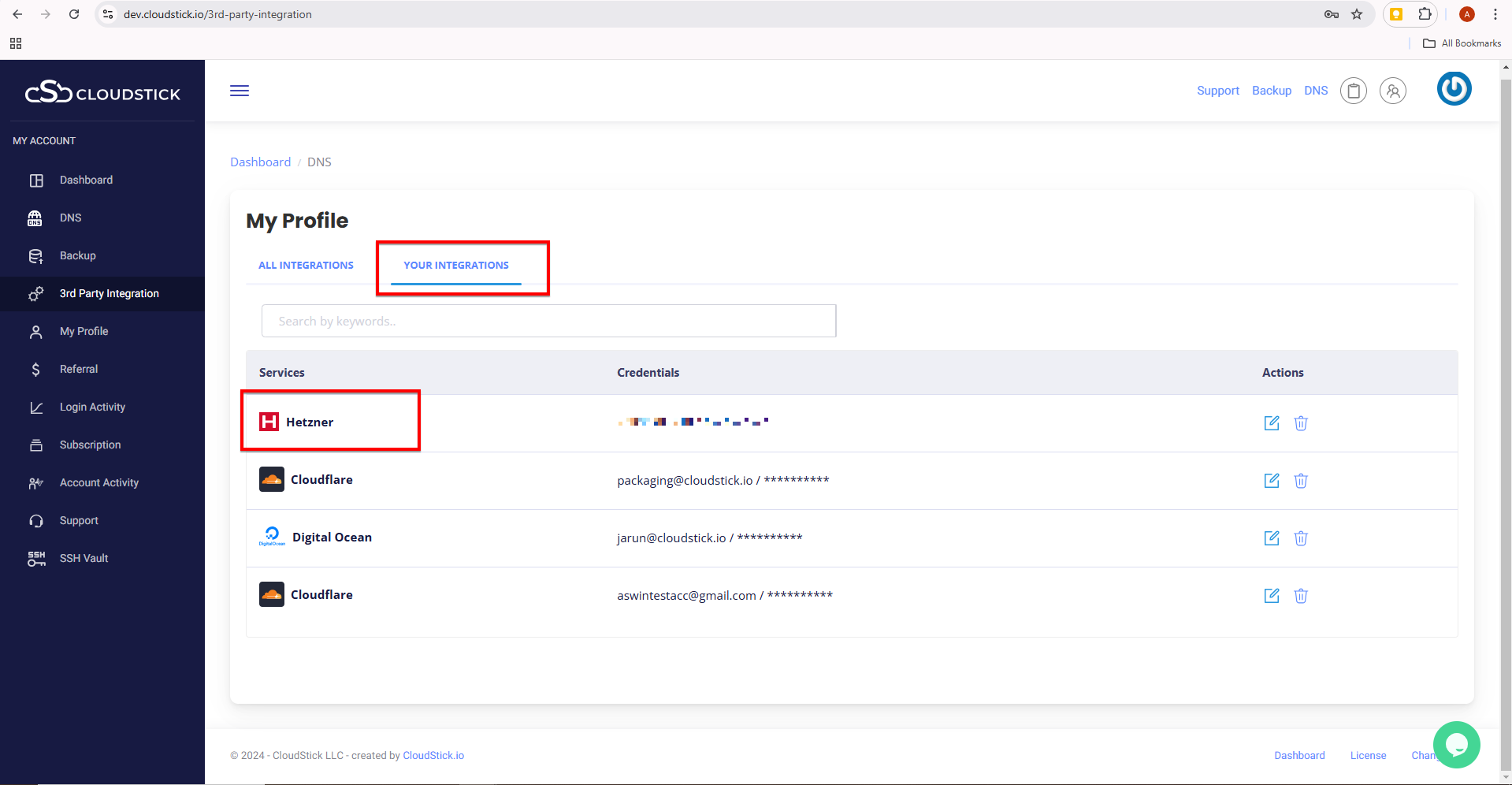Now click on the ‘Your integrations ‘ and verify ,if the Hetzner integration is listed.