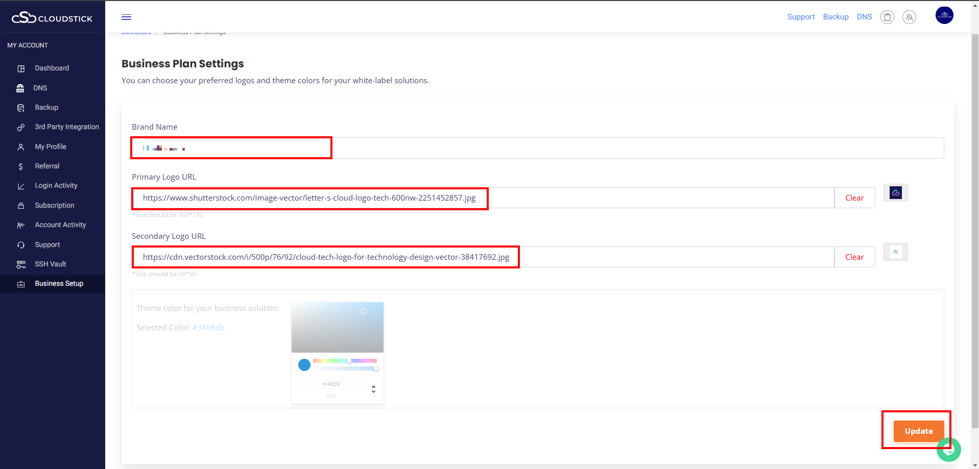 Enter the Brand name, paste the primary and secondary logo URL and click on Update button